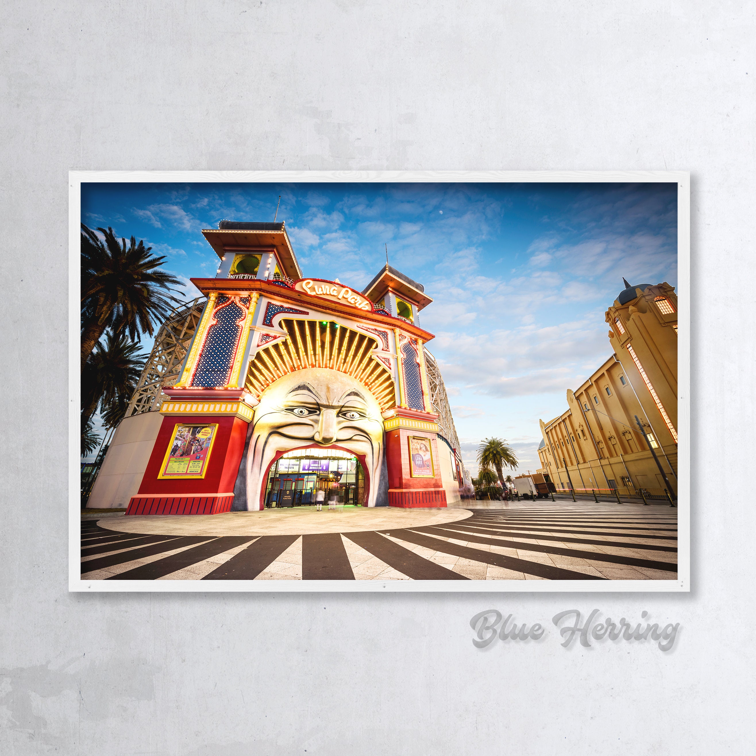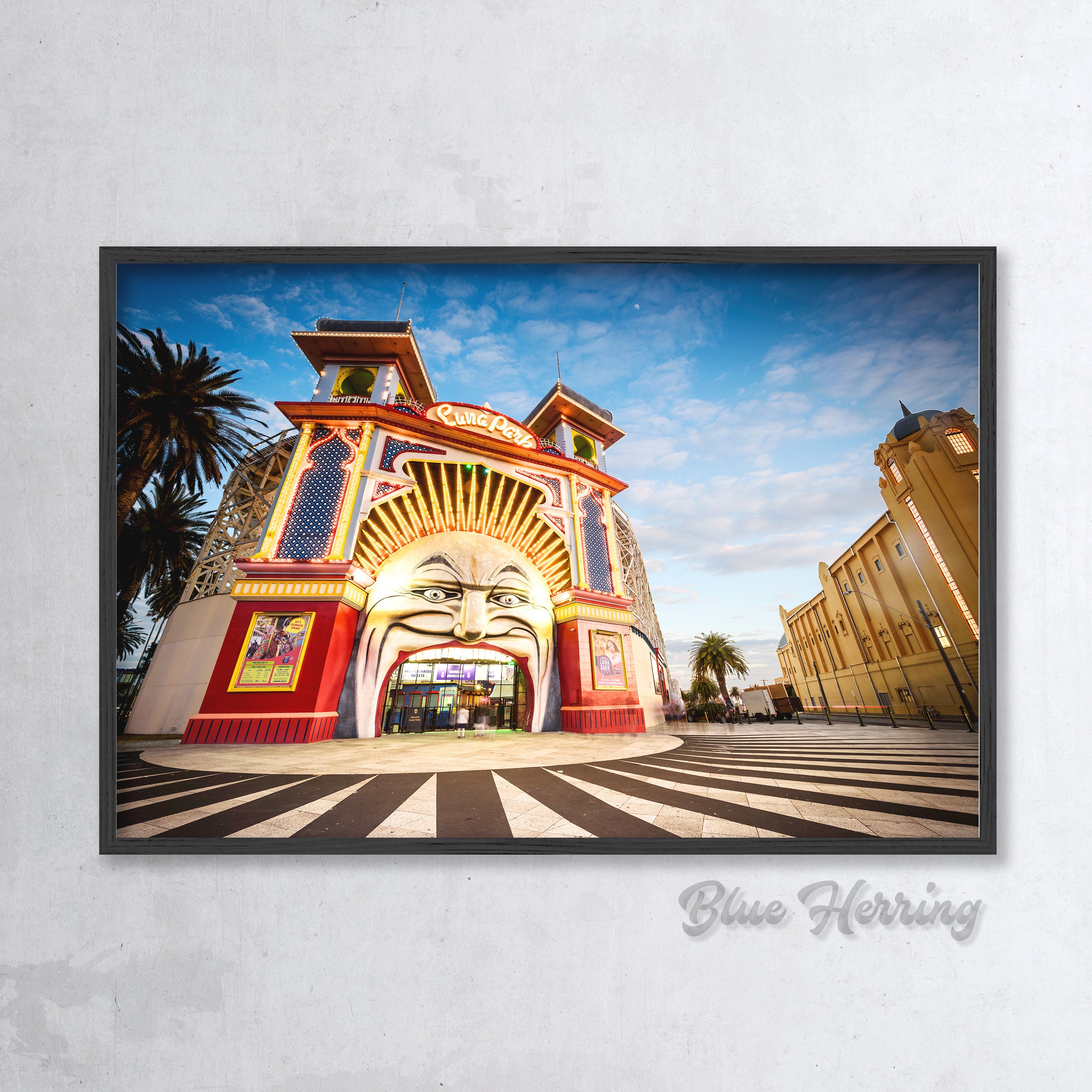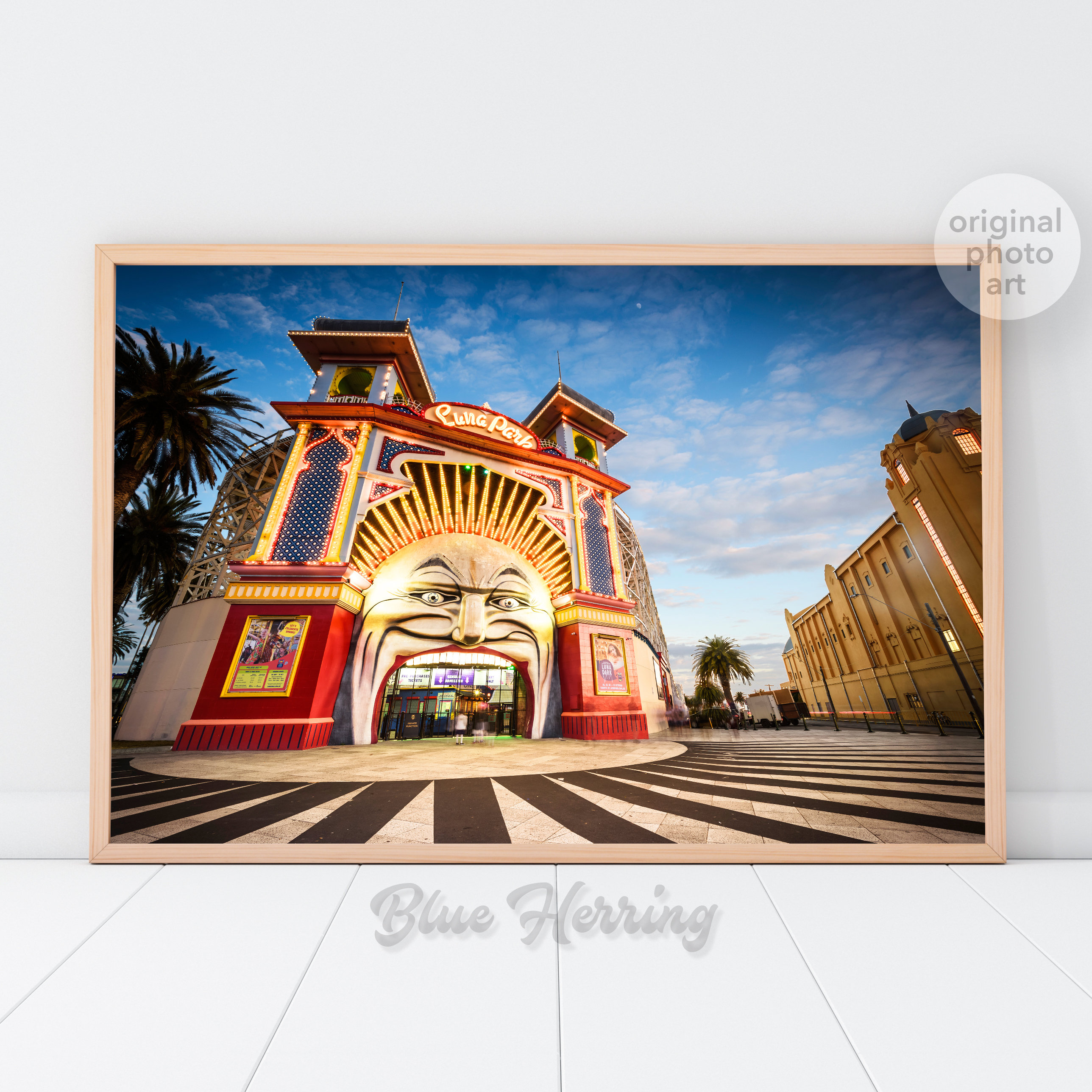 This Melbourne Australia photo was shot in front of Luna Park in St Kilda. It includes the Palais Theatre and the sunset night sky. This photo wall art is ideal for Carnival Print, StKilda Beach Poster, Kids Room Decor, Oversized Art, Travel Gift, Photography Backdrop or a House Warming Gift, even as a blank wall solution!